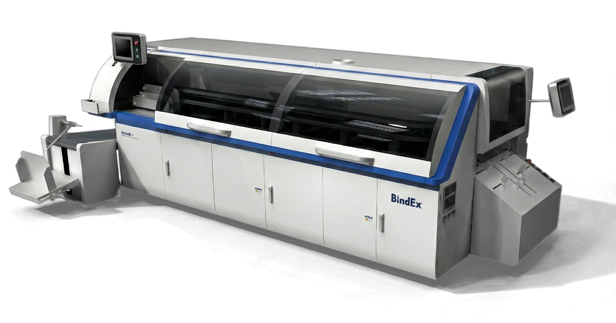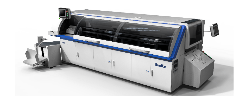 A ECOBINDER é uma encadernadora perfect binder totalmente automatizada de 5 gavetas, ideal para encadernação flexível e rápida de pequenas e médias tiragens. Possui dispositivo automático de medição de espessura do livro (exceto para o tamanho da capa, que é manual via touchscreen). Conta com seção de fresagem profissional independente para preparação superior da lombada, unidades duplas de cola de lombada com controle de temperatura independente e corte automático de cola, seção de cola lateral com ajuste automático de largura, e guias de capa com vinco e ajuste automático. O sistema heavy-duty de came duplo garante qualidade superior na prensagem da lombada. A máquina é equipada com entrega automática de livros e pode ser conectada a uma cortadora trilateral digital para formar uma linha de encadernação digital completa. Disponível em dois modelos: ECOBINDER e ECOBINDER PRO.