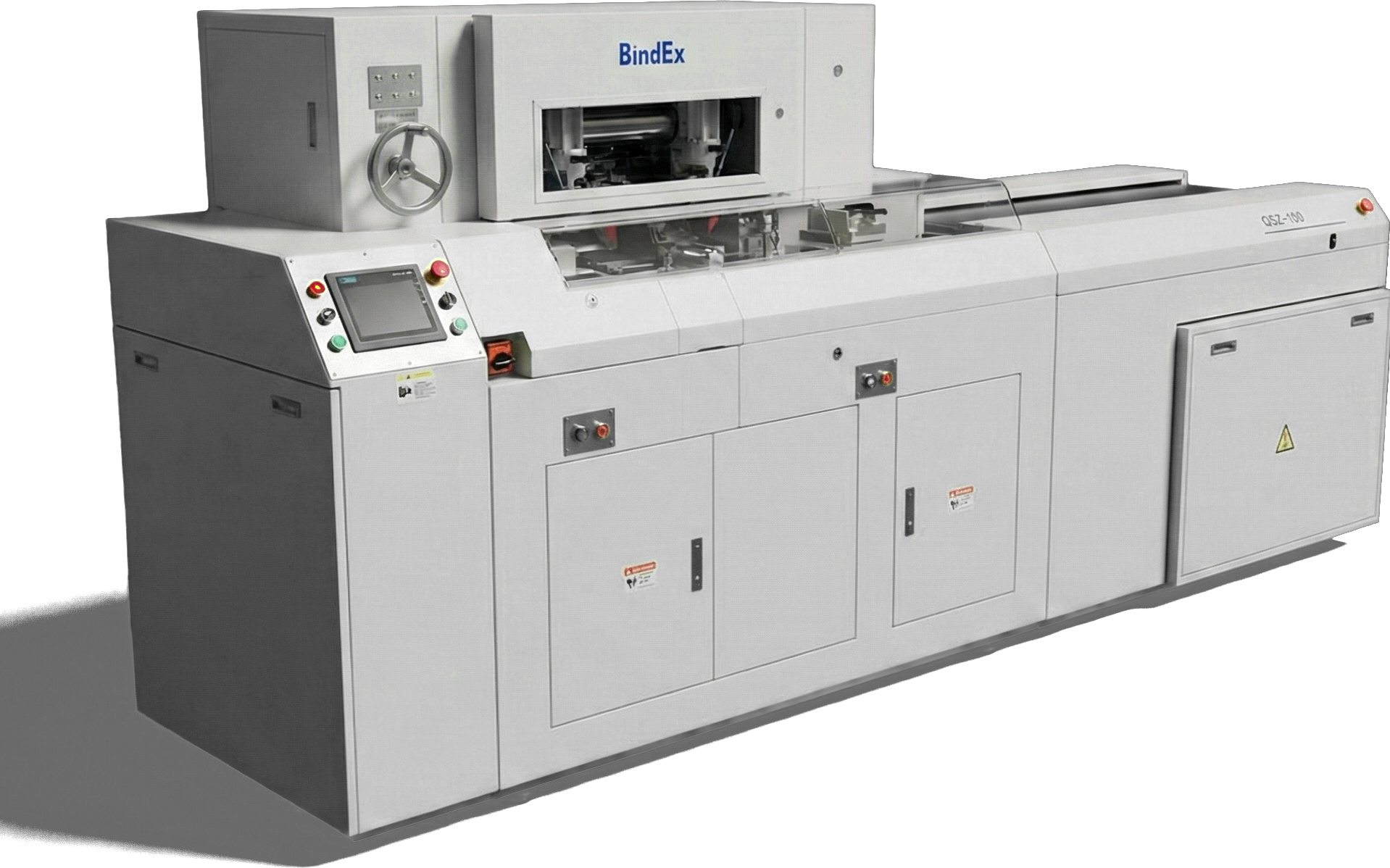 A QSZ100 é uma cortadora trilateral fundida em peça única com forte rigidez, garantindo precisão e qualidade de corte. Ciclo automático completo de alimentação por correia, fixação, prensagem, corte e entrega. Dispositivo de lubrificação de corte garante corte suave. Sistema de lubrificação automática. Controle PLC com velocidade variável. Máquina totalmente fechada, segura e com baixo ruído.